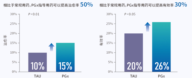 一项针对重度抑郁症患者的大样本、随机、对照研究(n=1167),患者随机分配接受:PGx指导用药治疗(PGx,n=560)和常规用药治疗(TAU,n=607)。研究旨在评估PGx指导用药对药物治愈率和有效率的影响。结果显示:相比于常规用药,PGx指导用药可以提高治愈率50%,提高有效率30%。